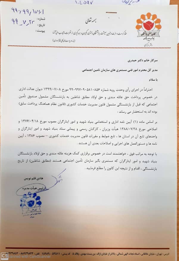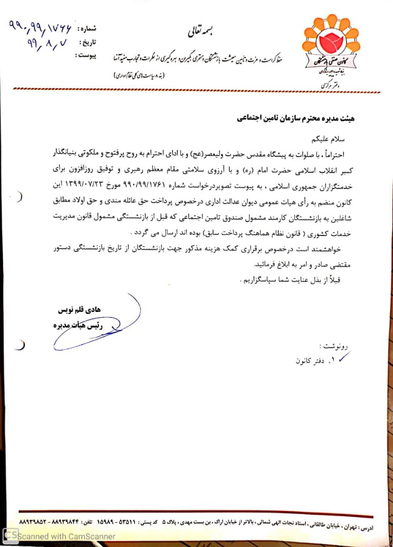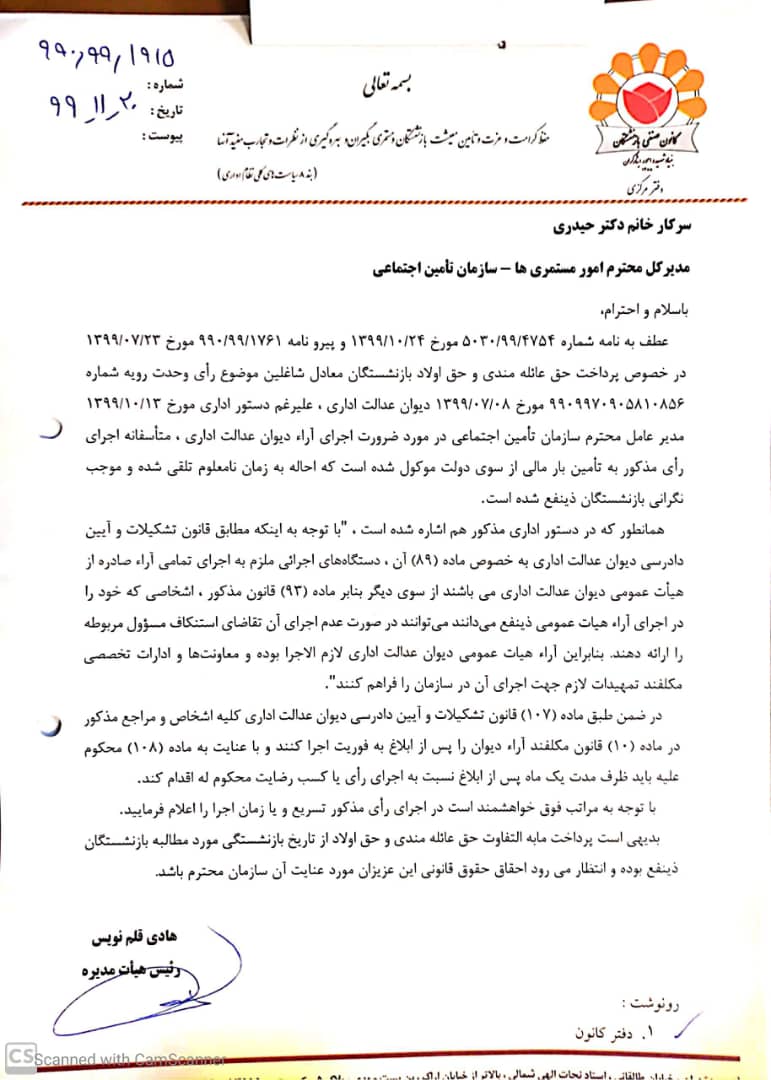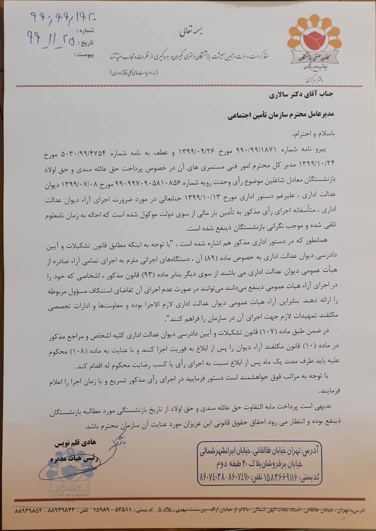 متعاقباً طی نامه شماره 990.99.1915 مورخ 1399.11.20 کانون به مدیر کل امور مستمری های سازمان تأمین اجتماعی اعلام شد : علیرغم دستور اداری مورخ 1399.10.13 مدیر عامل محترم سازمان تأمین اجتماعی در مورد ضرورت اجرای آراء دیوان عدالت اداری ، متأسفانه اجرای رأی مذکور را به تأمین بار مالی از سوی دولت موکول نموده اید که احاله به زمان نا معلوم تلقی شده و موجب نگرانی بازنشستگان ذینفع شده است.