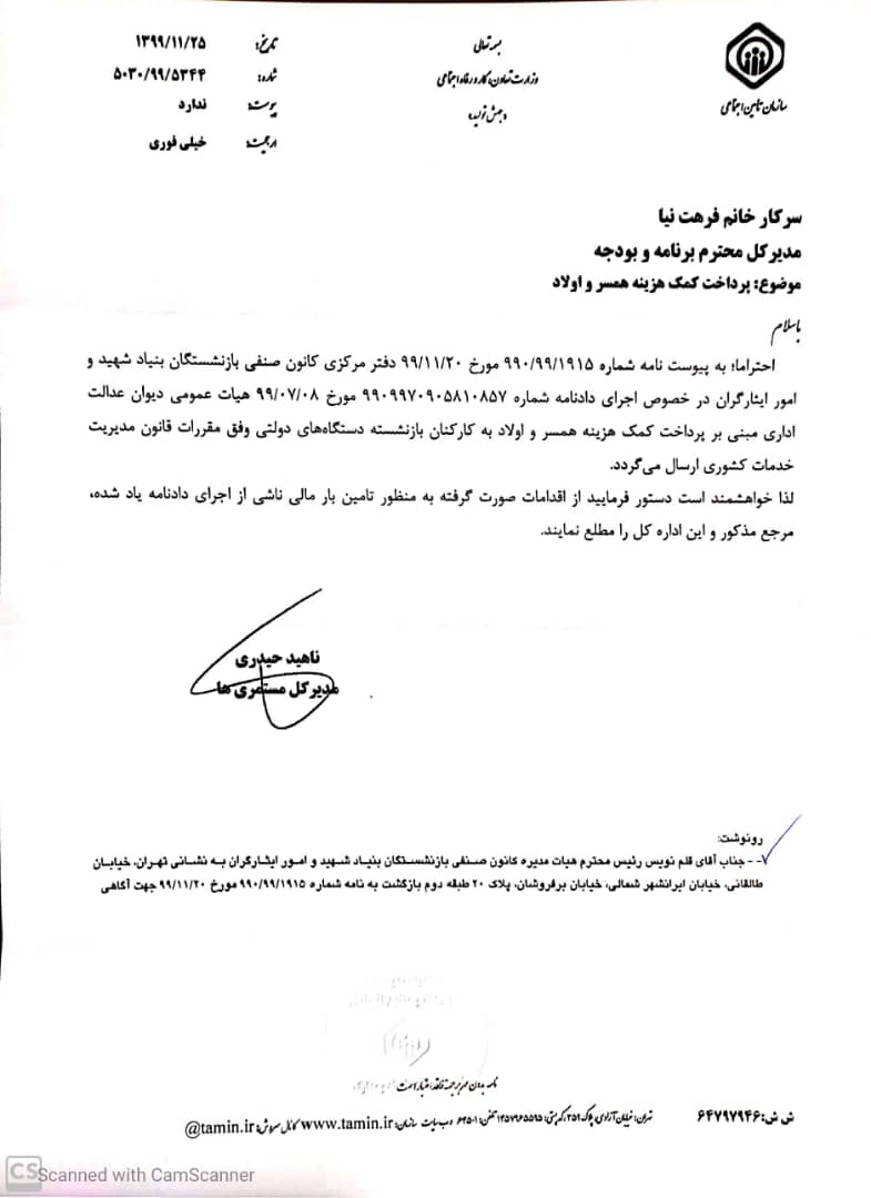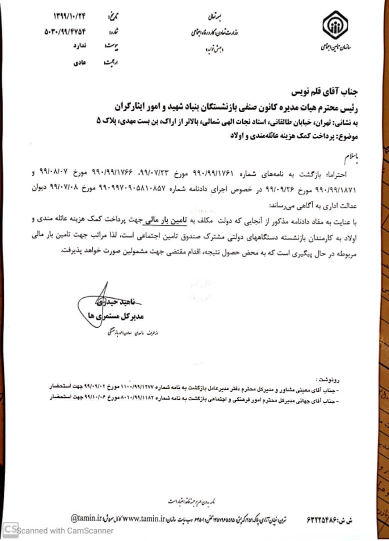 مدیر کل امور مستمری های سازمان تأمین اجتماعی طی نامه شماره 5030.99.5344 مورخ 1399.11.25 به مدیر کل برنامه و بودجه آن سازمان ضمن ارسال نامه شماره 990.99.1915 مورخ 1399.11.20 کانون موضوع تأمین بارمالی را پیگیری نمود.