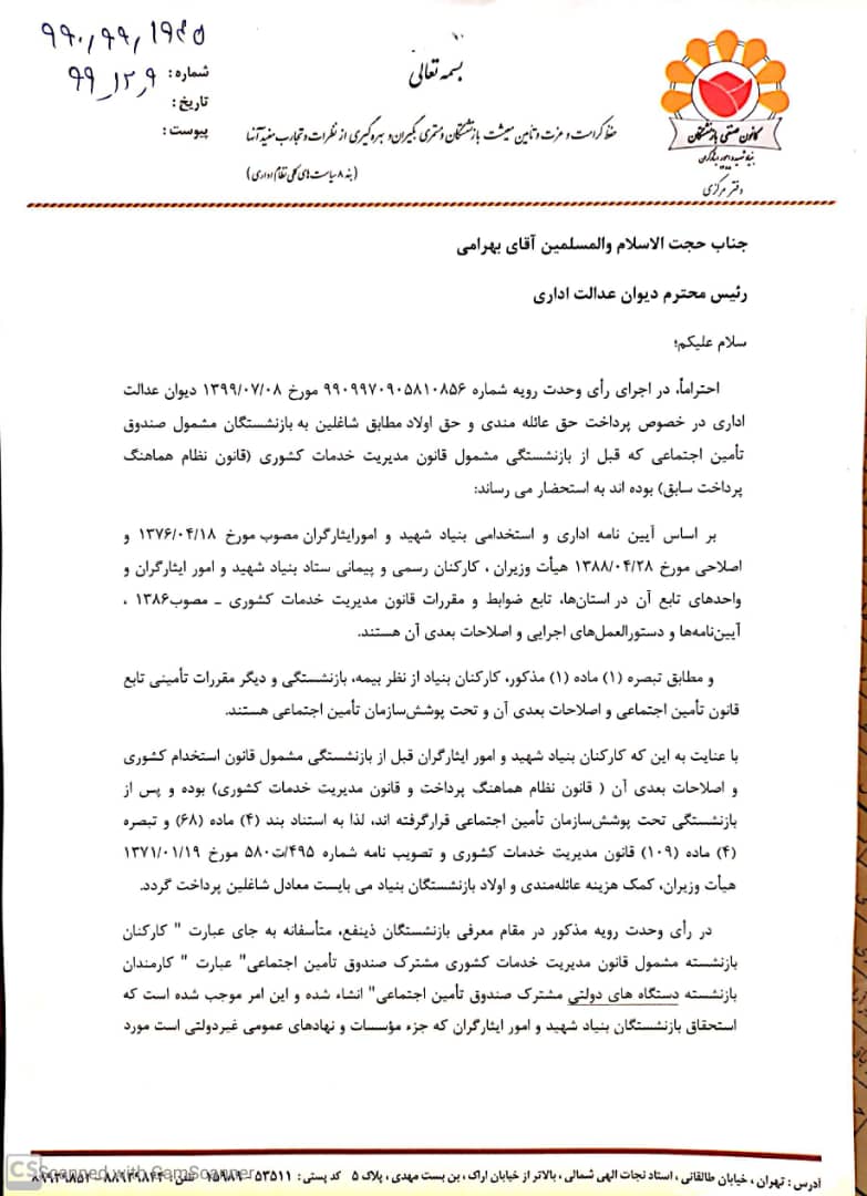 با توجه به این که متأسفانه از سوی دیوان عدالت اداری، برای تعدادی از بازنشستگان بنیاد آرای منفی صادر شده که این امرعمدتاً ناشی از به کار بردن عبارت "کارکنان دولت" در رأی وحدت رویه دیوان عدالت اداری بوده است، طی نامه شماره 990.99.1945 مورخ 1399.12.09 به رییس دیوان عدالت اداری خواسته شده تا نسبت به رفع ابهام از رأی وحدت رویه مذکور اقدام نمایند.
