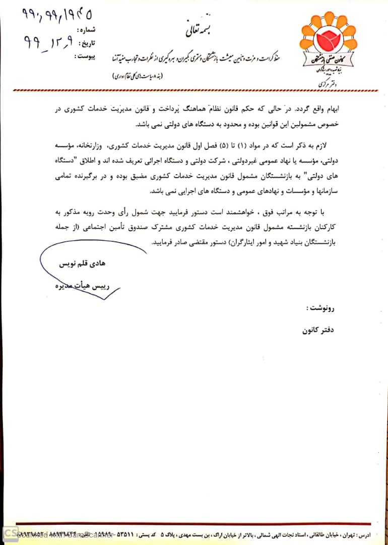 در بخشی از نامه مذکور آمده است: در مقام معرفی بازنشستگان ذینفع، متأسفانه به جای عبارت " کارکنان بازنشسته مشمول قانون مدیریت خدمات کشوری مشترک صندوق تأمین اجتماعی" عبارت " کارمندان بازنشسته دستگاه هاي دولتی مشترك صندوق تأمین اجتماعی" انشاء شده و این امر موجب شده است که استحقاق بازنشستگان بنیاد شهید و امور ایثارگران که جزء مؤسسات و نهادهای عمومی غیردولتی است مورد ابهام واقع گردد. در حالی که حکم قانون نظام هماهنگ پرداخت و قانون مدیریت خدمات کشوری در خصوص مشمولین این قوانین بوده و محدود به دستگاه های دولتی نمی باشد.