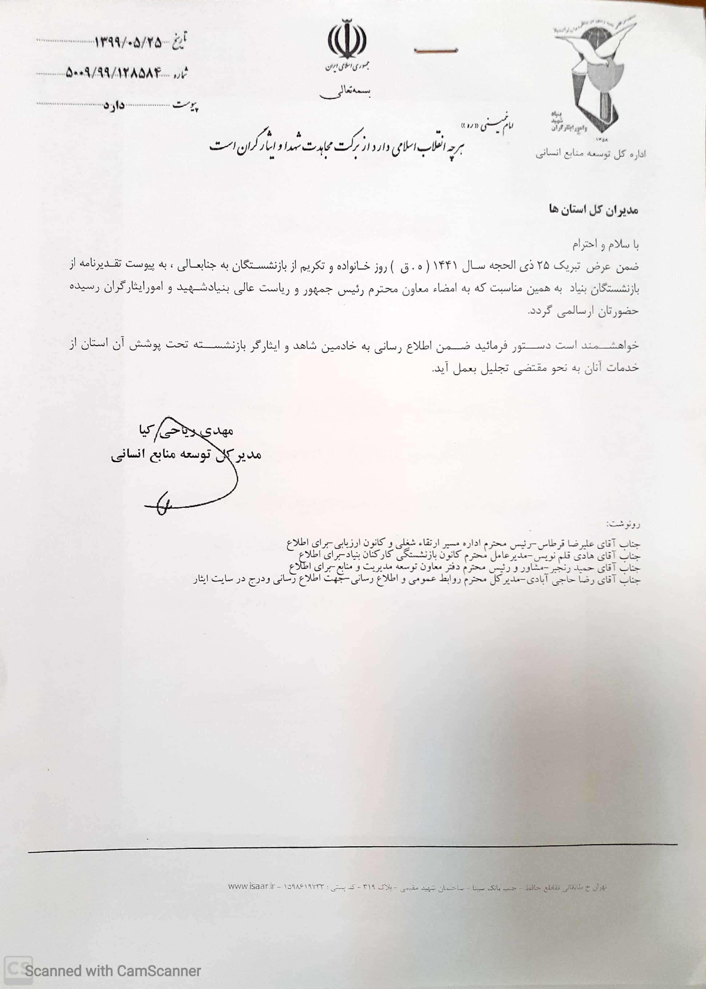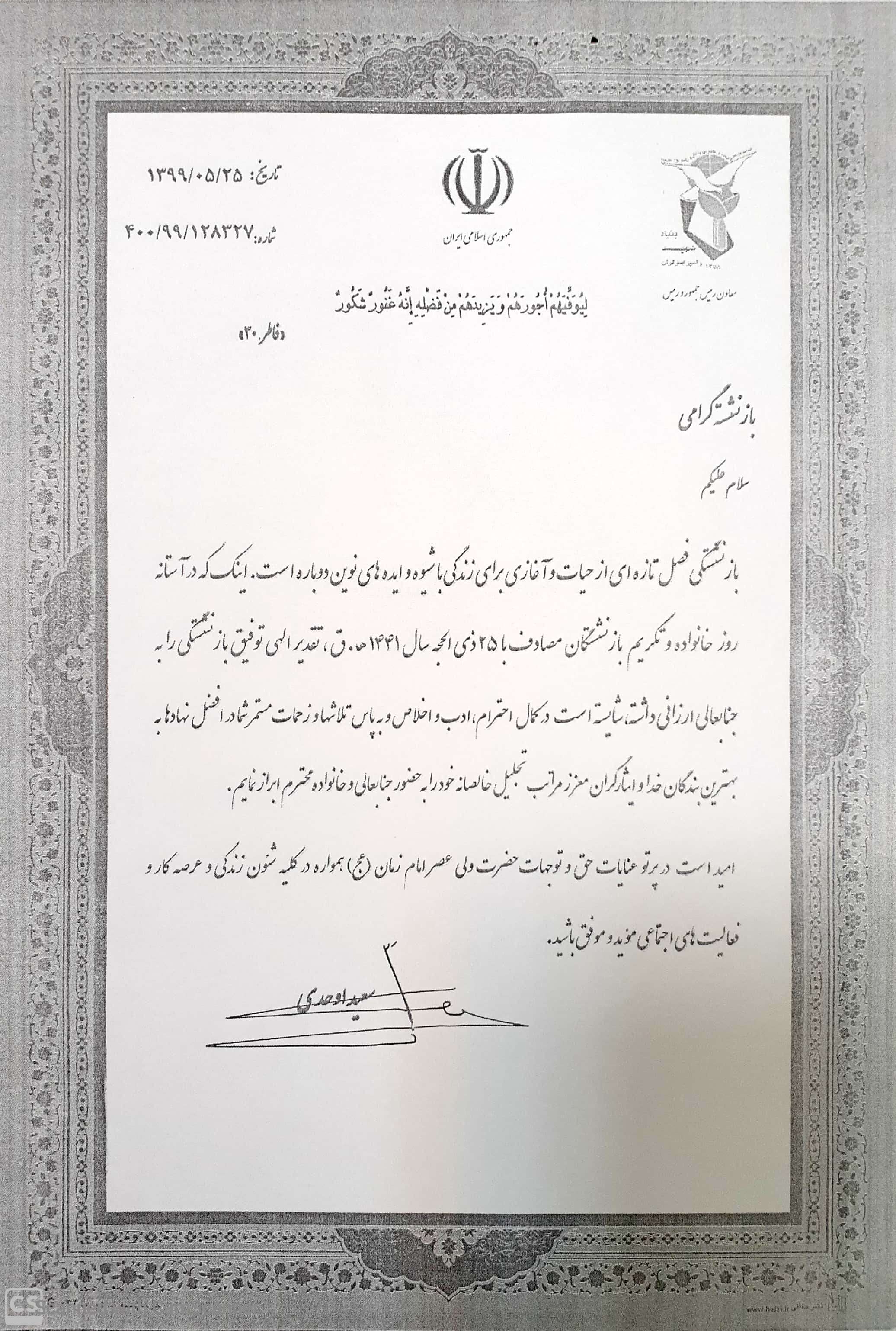 معاون محترم رییس جمهور و رییس بنیاد شهید و امور ایثارگران به مناسبت روز تکریم بازنشستگان پیام تبریکی به شرح زیر صادر نمود: بازنشسته گرامی سلام علیکم بازنشستگی فصل تازه ای از حیات و آغازی برای زندگی با شیوه و ایدههای نوین دوباره است اینک که در آستانه روز خانواده و تکریم بازنشستگان مصادف با ۲۵ ذی الحجه سال ۱۴۴۱ ه. ق تقدیر الهی توفیق بازنشستگی را به جنابعالی ارزانی داشته، شایسته است در کمال احترام ، ادب و اخلاص و به پاس تلاشها و زحمات مستمر شما در افضل نهادها به بهترین بندگان خدا و ایثارگران معزز ، مراتب تجلیل خالصانه خود را به حضور جنابعالی و خانواده محترم ابراز نمایم. امید است در پرتو عنایات حق و توجهات حضرت ولی عصر امام زمان (عج) همواره در کلیه شئون زندگی و عرصه کار و فعالیت های اجتماعی مؤید و موفق باشید سعید اوحدی 1399/05/25